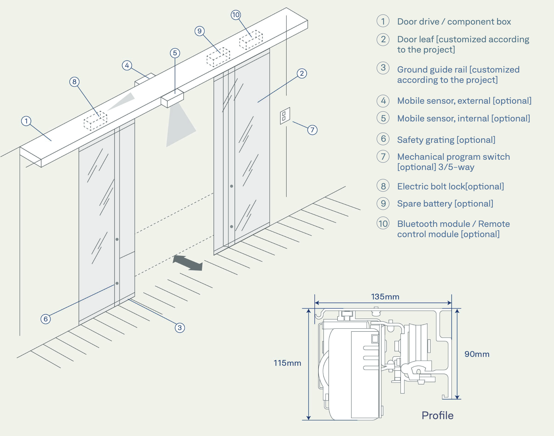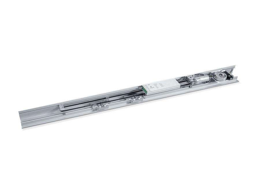 Automatic linear sliding door system for doors with a leaf weight of up to 90 kg